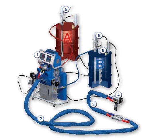 Là Máy phun sơn áp lực hai thành được thiết kế để trộn và bơm phun những phân tử vật liệu 2 thành phần có độ nhớt cao với hiệu suất cao chuyên dùng cho phun Polurea và PU Foam